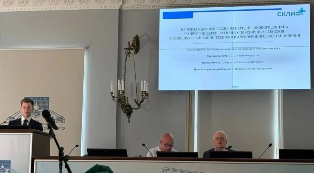 Коллектив Университетской клиники ПИМУ поздравляет врача-нейрохирурга Александра Петровича Сайфуллина с присуждением ученой степени кандидата медицинских наук. Защита диссертационной работы состоялась в марте 2026 года на базе диссертационного совета НИИ скорой помощи им. Н.В. Склифосовского.